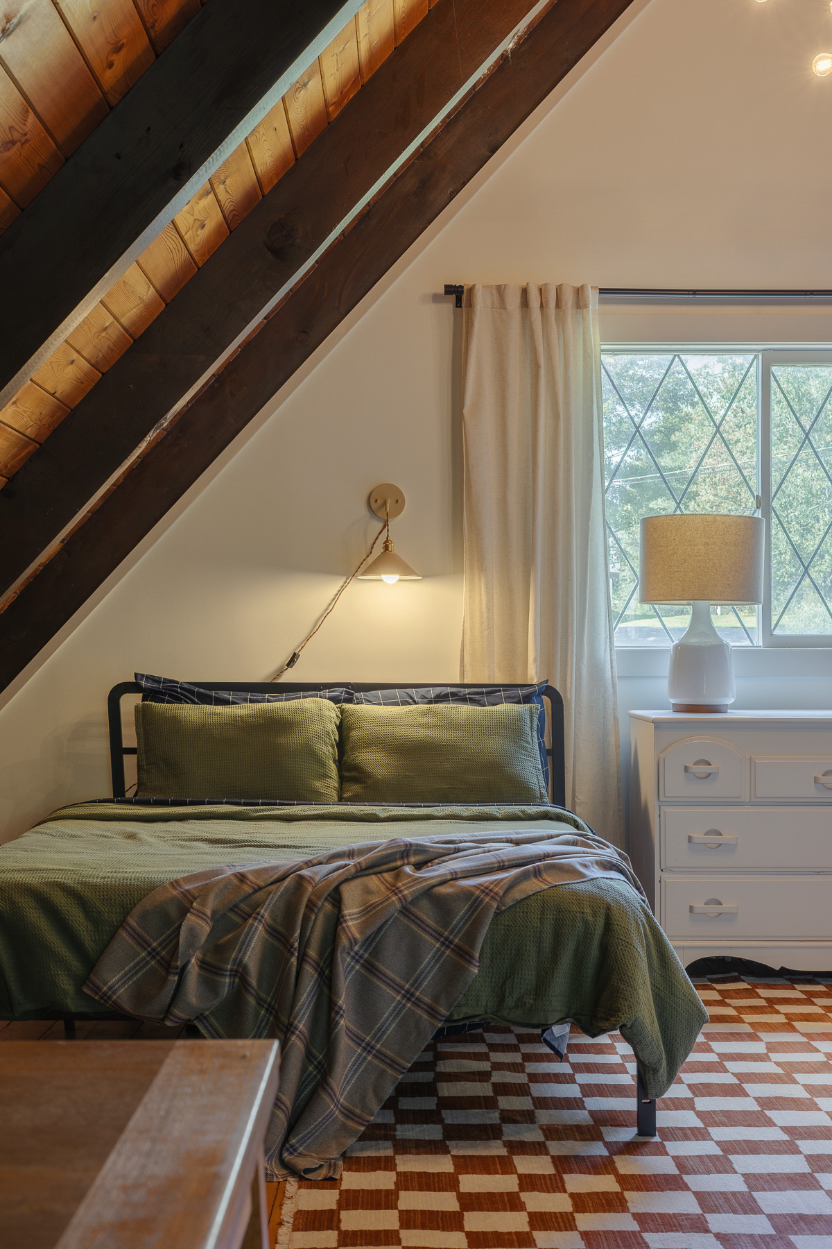 Back in the living space, a set of floating stairs leads you to the second floor. Going up the stairs, you are greeted with vaulted tongue-and-groove ceilings. There are two areas on the second level – one side is a sitting area with a full bathroom, while the other has two large beds in it, making it the perfect bunk room.