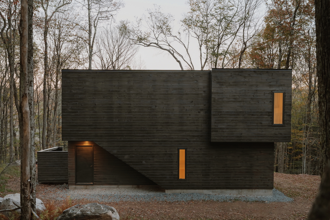 A winding country road leads to the secluded site, where a pine-clad, crisp geometry emerges from the trees.