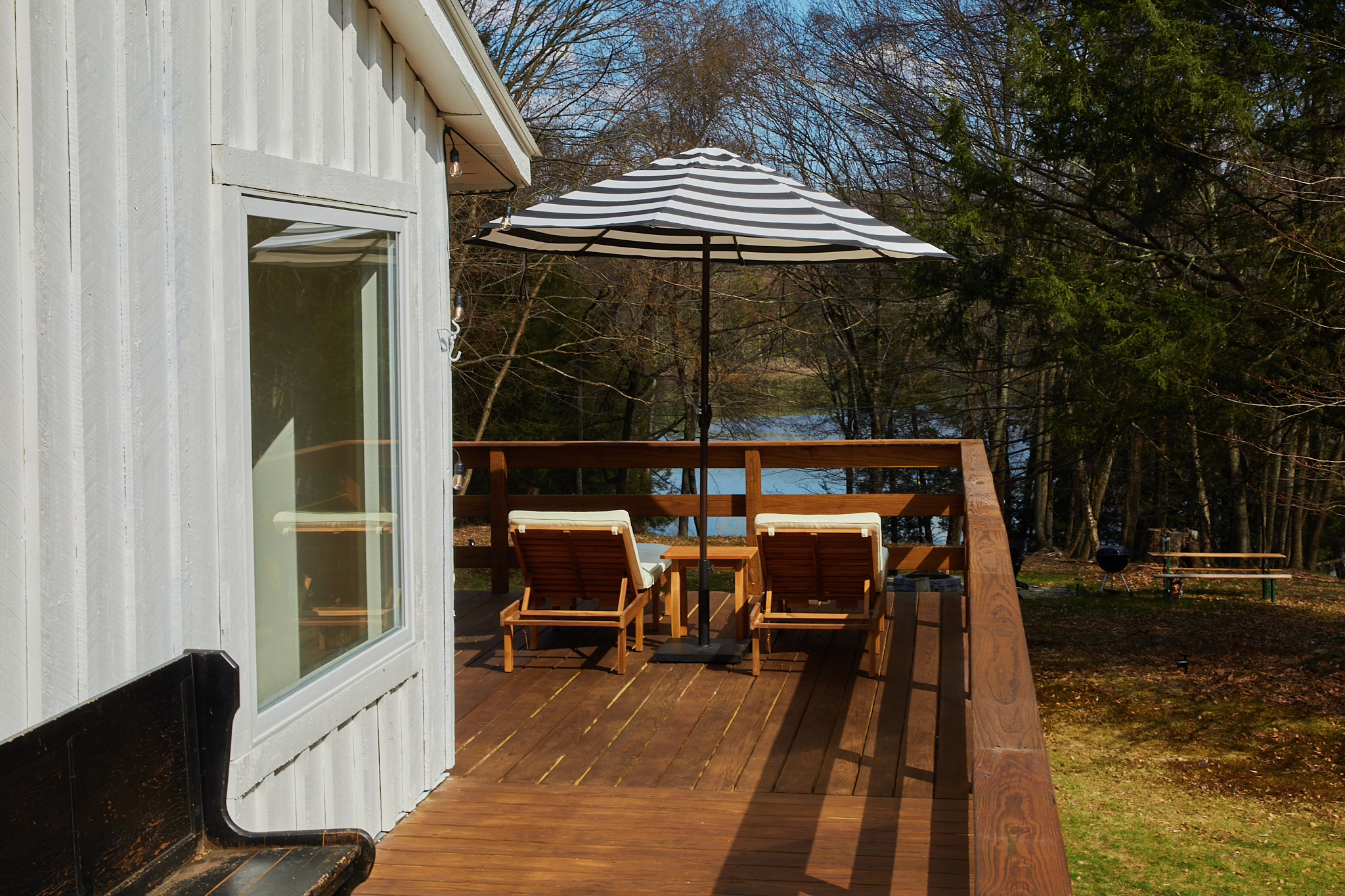 The wraparound sundeck expands the indoor space, while steps from the house is the fire pit area with peekaboo views of the Catskills’ foothills beyond. Venture a few steps further into the forest to stumble upon wild apple trees. The audible creek below lends an idyllic soundtrack to the setting.