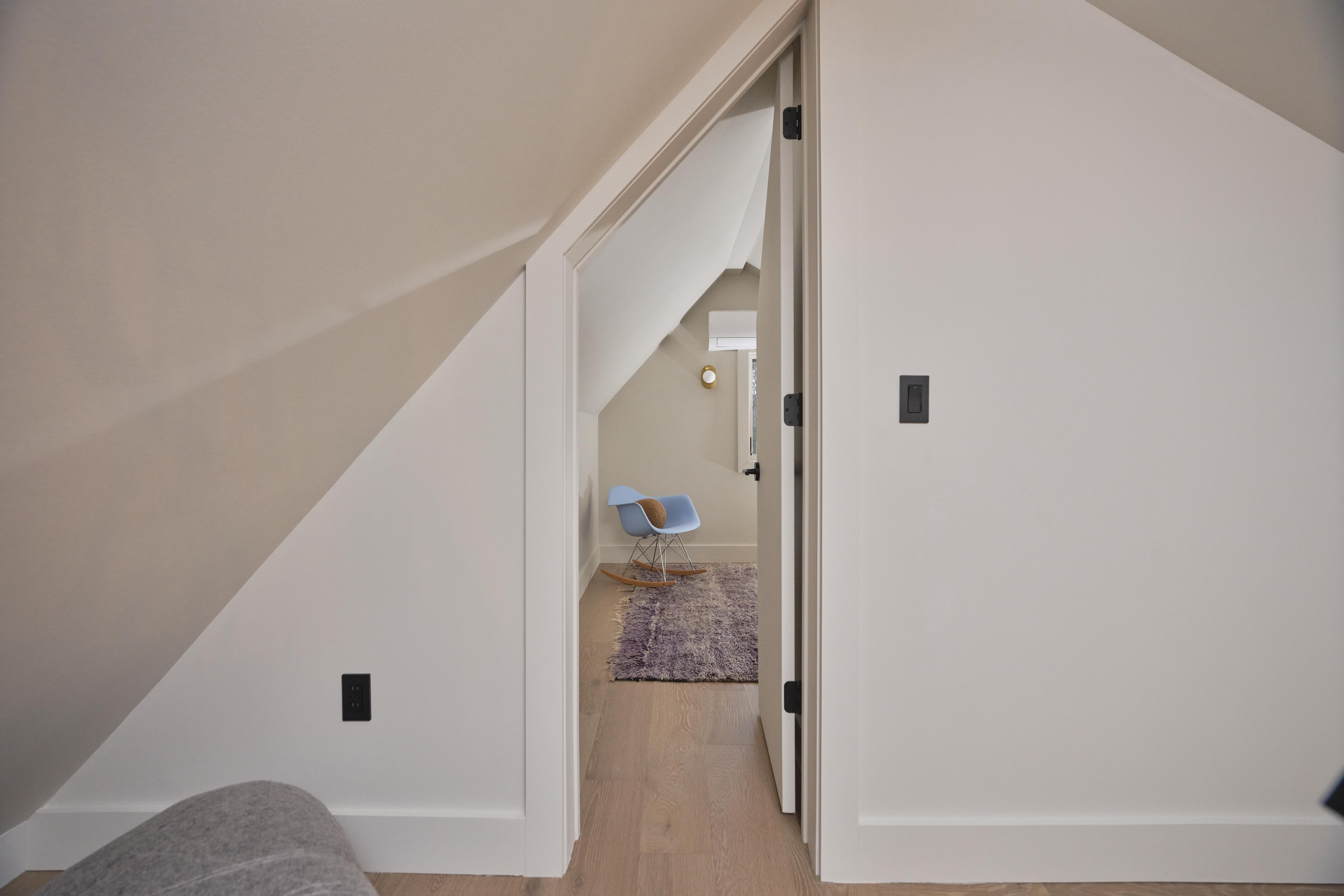 Oversized windows evoke treehouse living with all the comforts of a modern dwelling. Rounding out this level is a full bathroom with a rosy pink Cantera tile shower - from a naturally occurring volcanic stone, sage vanity, and gold accents. Ascend the stairs behind the kitchen to a loft with glass railings and clear sightlines into the living area, which also houses a cozy, tucked-away bedroom.