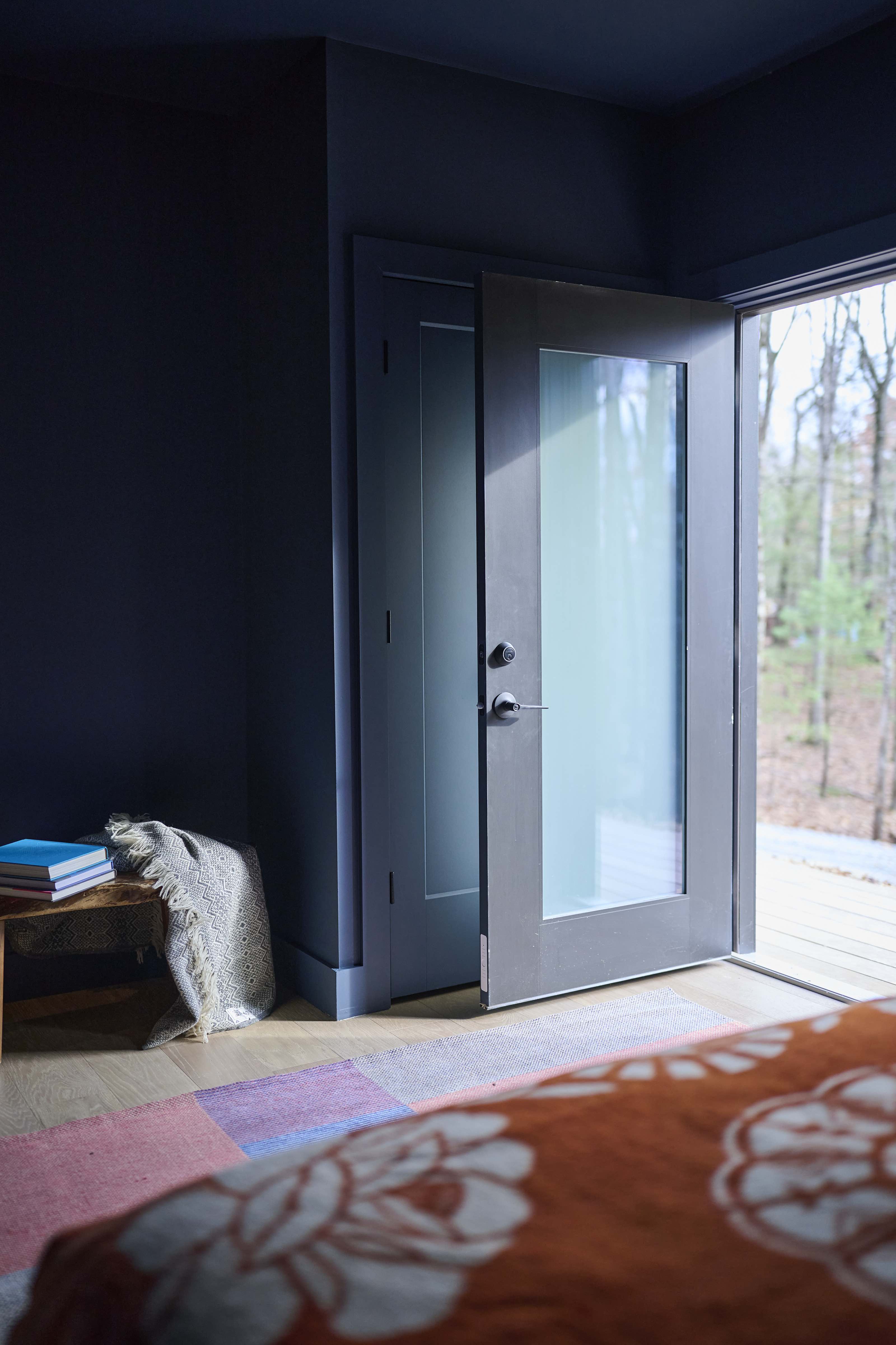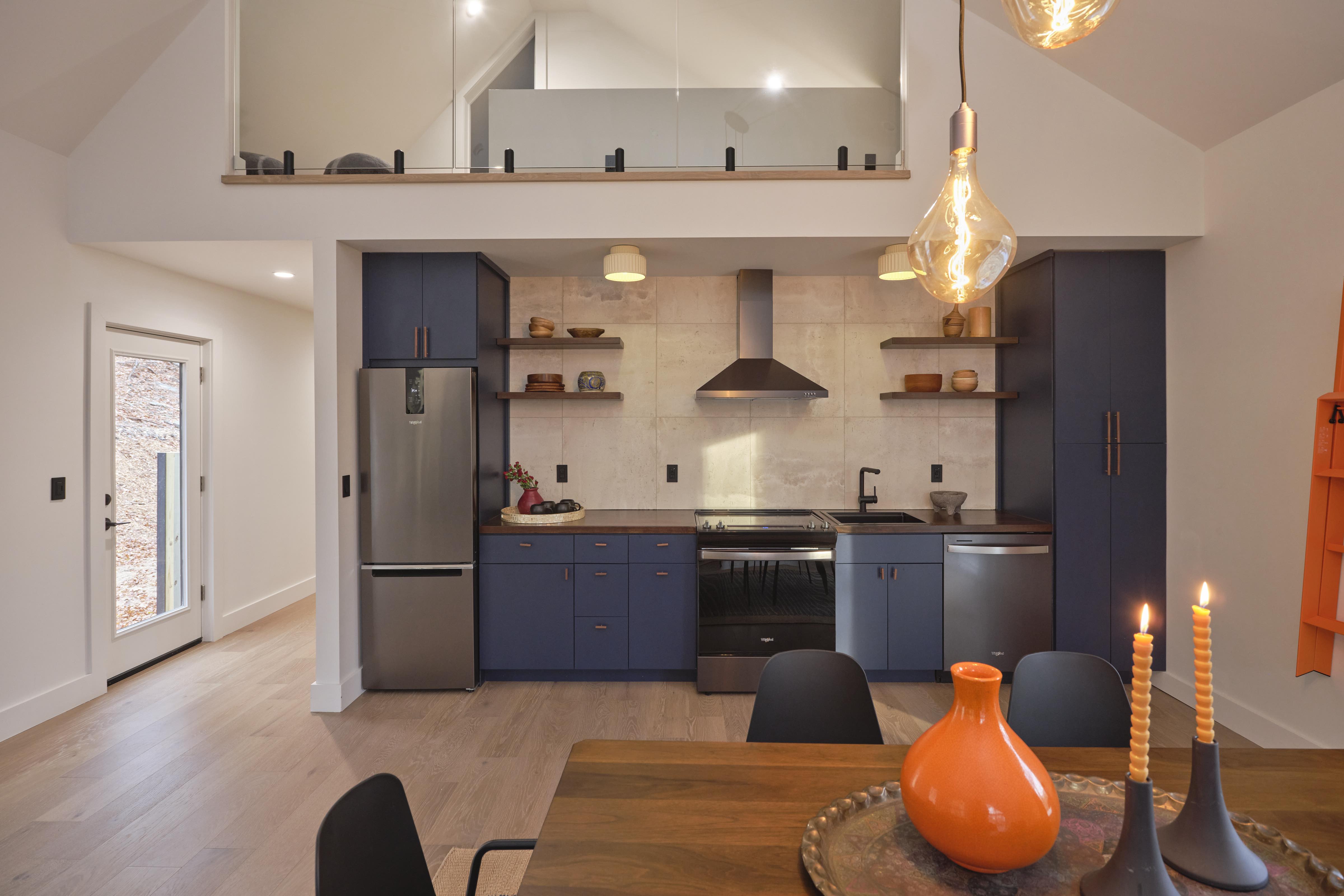 A wall of glass frames forested views and sunsets over a distant ridge, while sliding doors open to a deck overlooking a sleek, heated shipping container pool - a unique design that transforms from a summer swim spot to a winter hot tub retreat. Opposite, a kitchen with deep blue cabinets and stainless steel appliances opens onto a dining area anchored beneath vintage-inspired lighting.