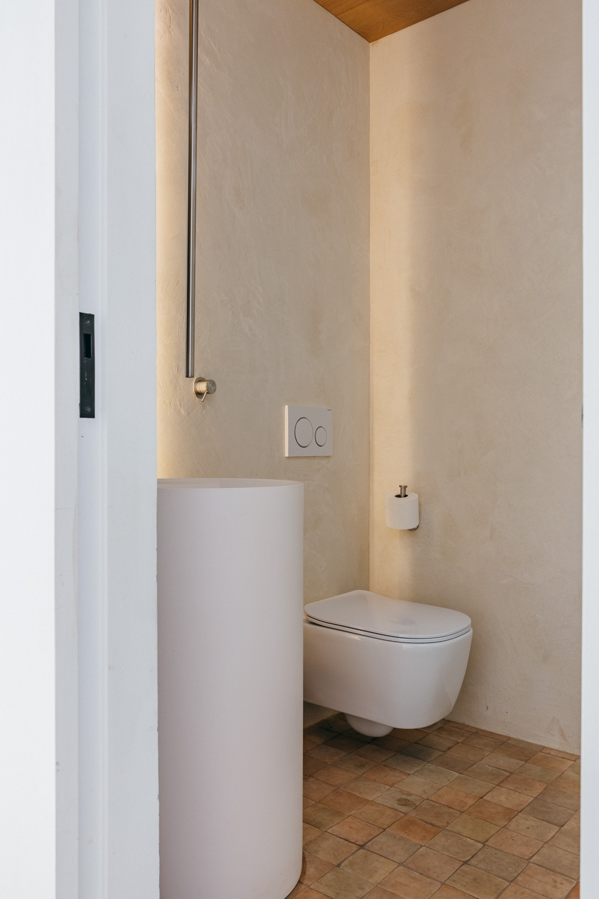 Configured as a two-bedroom home plus a versatile loft, the layout allows for a third bedroom or flexible workspace. Bathrooms, including the skylit primary suite, are finished with Antonio Lupi fixtures, offering a restrained, spa-like sensibility.