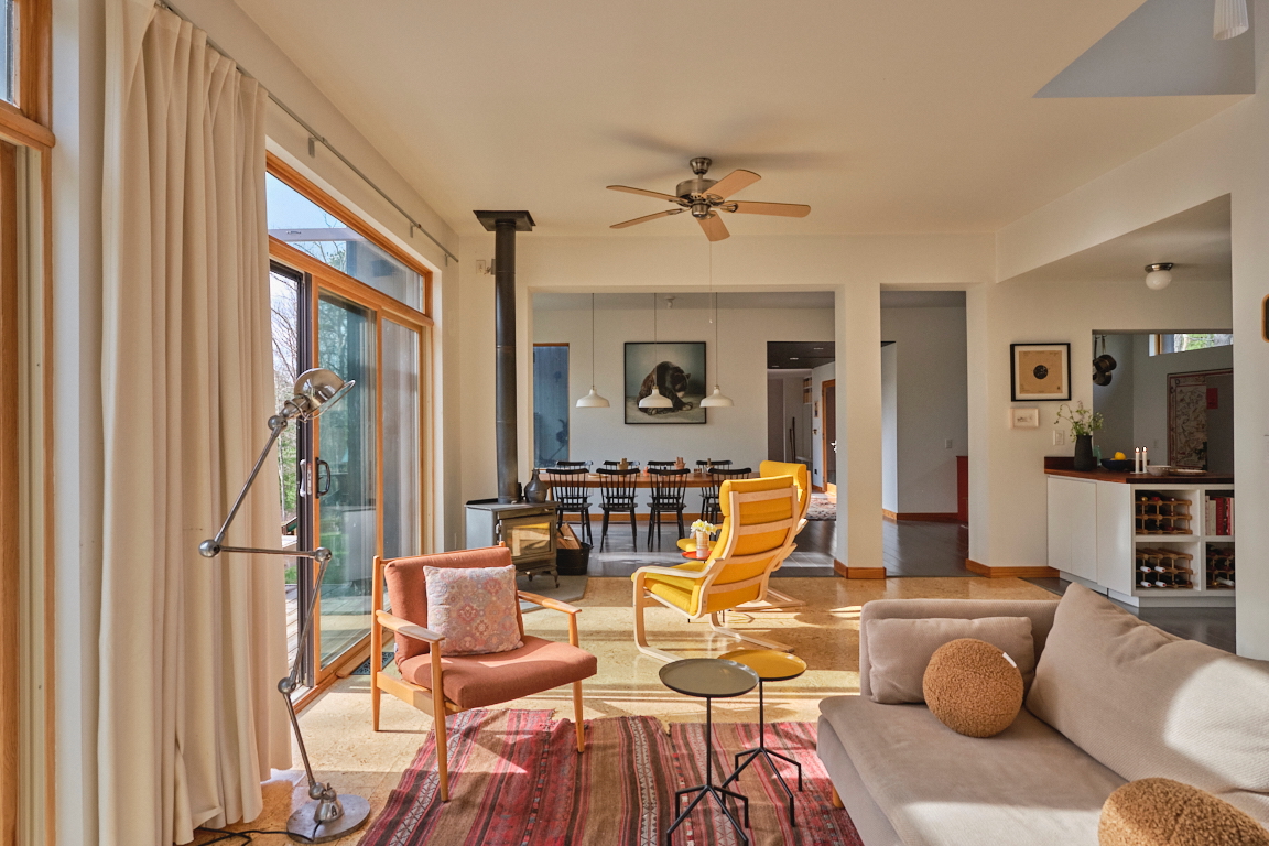 An all-glass breezeway serves as the entry point. To the left lies the open plan living space, featuring an extensive kitchen, dining and living areas. The living room, anchored by a wood stove, is flooded with golden afternoon light thanks to its crown jewel—a coveted wall of windows leading to an expansive sun deck, outdoor dining and fire pit. Colorful doors off the living room provide access to a shared full bathroom (with a charming outdoor shower accessible through a second door) and two guest bedrooms.